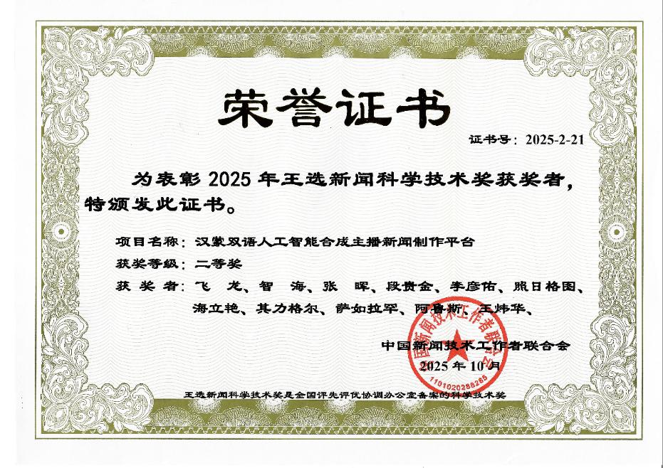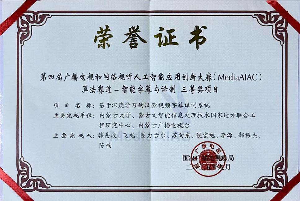我院飞龙教授团队荣获第四届广播电视和网络视听人工智能应用创新大赛三等奖