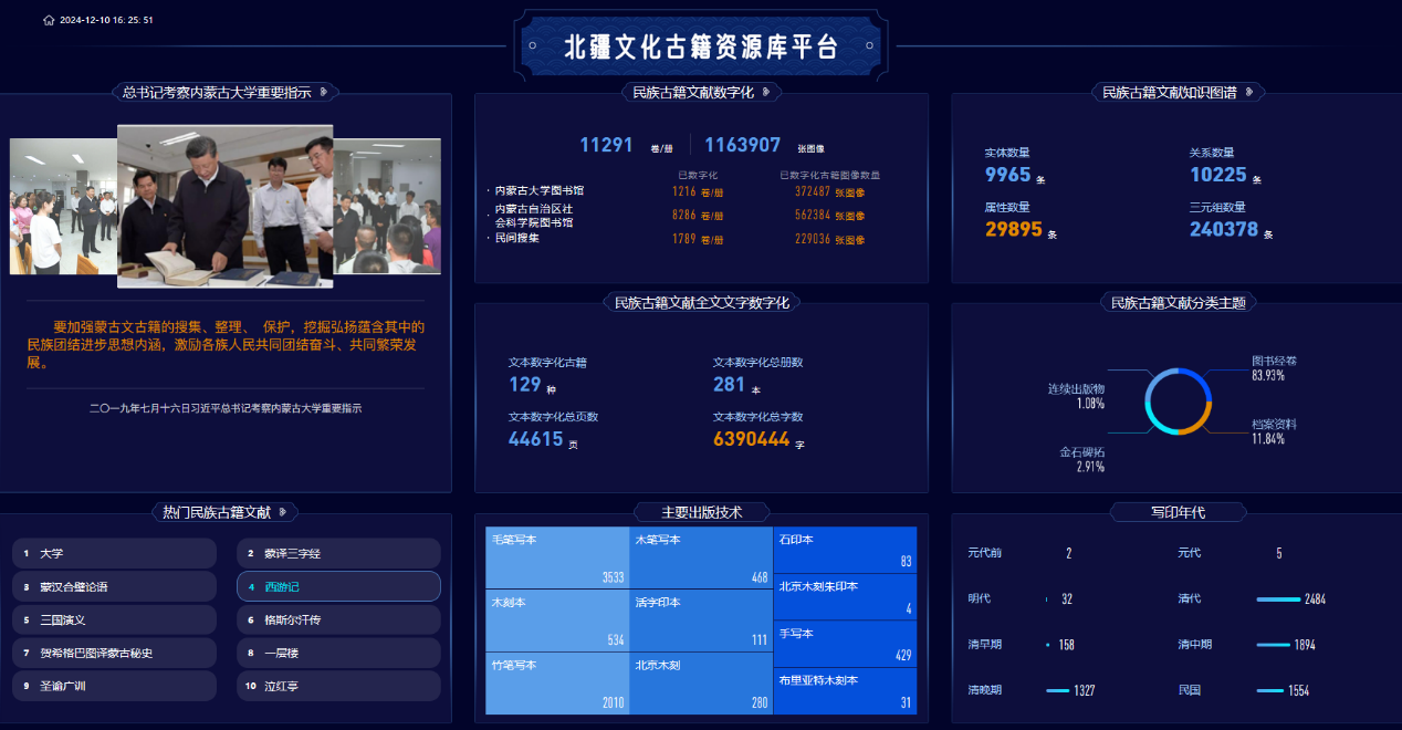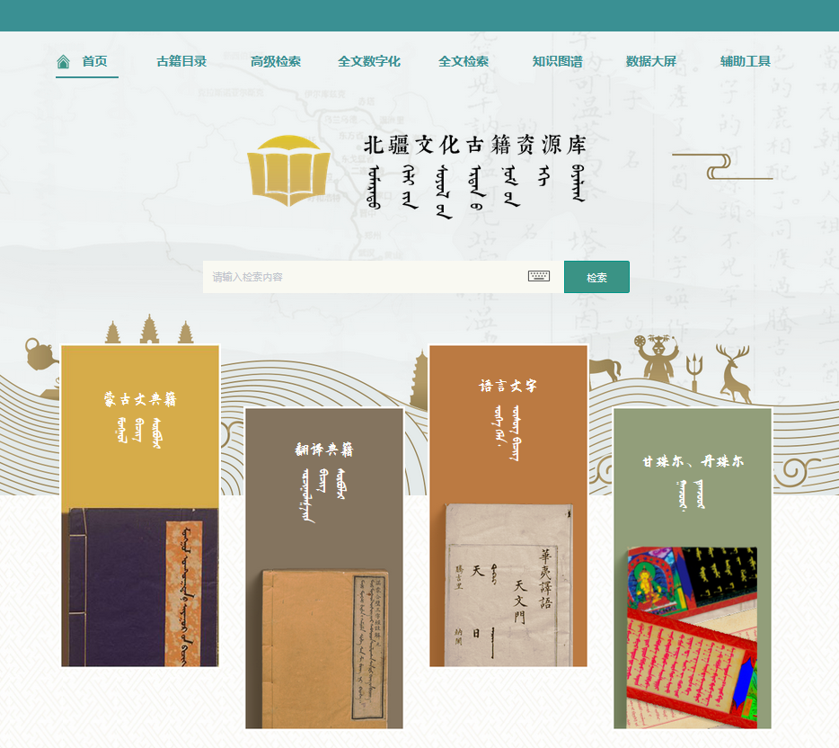 蒙古文智能信息处理技术国家地方联合工程研究中心组织了以飞龙教授为负责人的创新团队,攻克了古籍OCR、图像修复、知识图谱抽取等技术难题,成功开发了一整套蒙古文古籍数字化系统,建成一个数字化存储蒙古文古籍文献最多、检索分析智能化程度最高的 “北疆文化古籍资源库平台”(网址:http://bjwhgj.cn)。该平台包括民族古籍文献综合管理、多文种古籍OCR、古籍文献全文检索、民族古籍文献智能分析、民族古籍文献大数据可视化、古籍文献图像修复系统和民族古籍文献知识图谱等系统。tyc41183太阳成集团创新团队联合内蒙古社会科学院与成都联图科技有限责任公司等单位合作数字化了蒙古文古籍11291卷(册),共116.3万张古籍图像;侧重于铸牢中华民族共同体意识选择129部珍贵古籍文献进行全文文字数字化,字数为639万字;建立了24万条古籍文献知识图谱三元组。