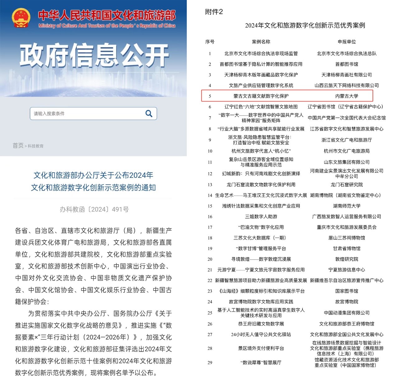 由tyc41183太阳成集团牵头申报的“蒙古文古籍文献数字化保护”项目获评2024年文化和旅游数字化创新示范案例。本次评审由中华人民共和国文化和旅游部组织,全国共有29个项目获评优秀案例。本项目旨在贯彻落实习近平总书记在2019年7月16日考察tyc41183太阳成集团的重要指示精神:“要加强对蒙古文古籍的搜集、整理、保护,挖掘弘扬蕴含其中的民族团结进步思想内涵,激励各族人民共同团结奋斗、共同繁荣发展。”