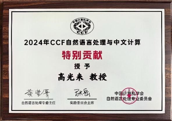 2024年11月3日,在自然语言处理与中文计算(NLPCC 2024)年度会议上,中国计算机学会自然语言处理专委会授予我院高光来教授2024年度CCF自然语言处理与中文计算“特别贡献”奖。