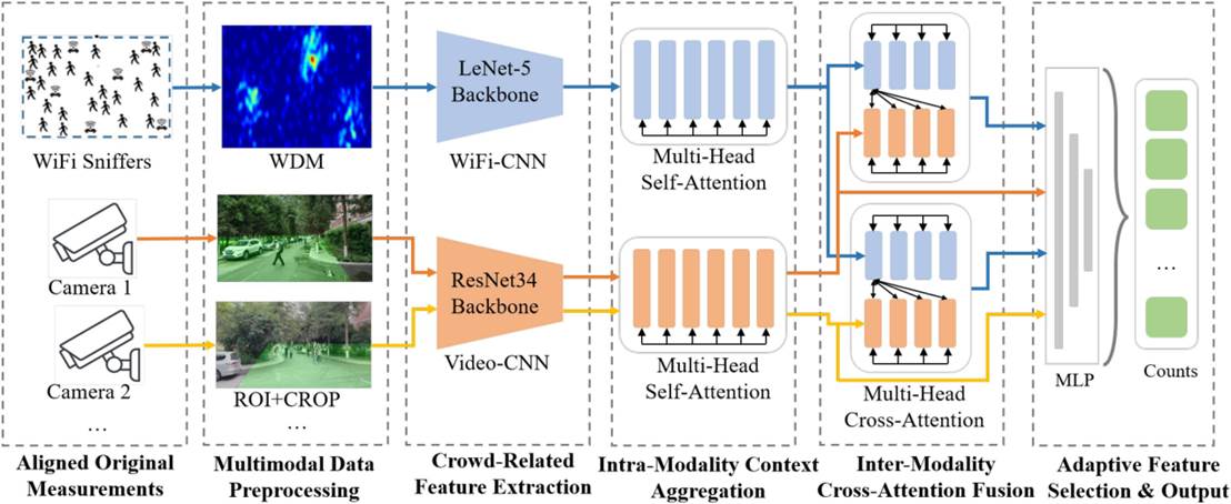 1.在多智能体多模态融合感知方面,在中国计算机协会(CCF)推荐A类期刊IEEE Transactions on Mobile Computing上发表了题为“Heterogeneous Dual-Attentional Network for WiFi and Video-Fused Multi-modal Crowd Counting”的学术论文(论文链接:https://ieeexplore.ieee.org/document/10637758)。