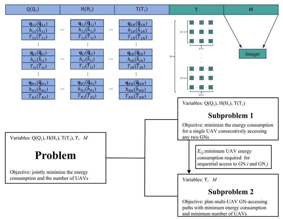 多无人机协同感知已广泛应用于数据收集、环境监测等领域,如何减少特定任务执行时的无人机数量和能耗是其中的关键问题。现有研究多集中于二维场景、假设无人机数量固定且场景特定,导致通用性不足。对于三维场景下多无人机访问多个地面节点的任务,课题组将其建模为最少数量智能体高能效多目标访问问题,并进一步分解为两个子问题:(1)利用凸优化和路径离散化技术使单个无人机连续访问任意两个目标节点的能耗最小;(2)利用基于改进粒子群优化和贪心路径分配的近似框架(MPSO-GPA)实现最少数量无人机情况下的高能效路径规划。