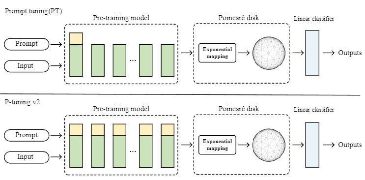 连续提示调整因其在冻结语言模型的同时只训练连续提示的能力而备受关注。这种方法大大减少了下游任务的训练时间和存储空间。在这项工作中,我们深入研究了提示和下游文本输入之间的层次关系。在提示学习中,前缀提示作为指导下游语言模型的模块,在前缀提示和后续输入之间建立了层次关系。此外,我们还探索了利用双曲空间对层次结构建模的好处。我们使用 Poincar\'{e} 盘将预训练模型的表示从欧几里得空间投影到双曲空间,从而有效地捕捉到提示和输入文本之间的层次关系。在自然语言理解(NLU)任务上的实验表明,双曲空间可以模拟提示和输入文本之间的层次关系。