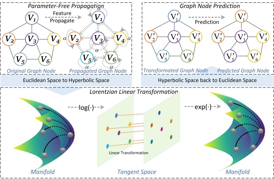 线性图卷积网络(GCN)常用于对图数据中的节点进行分类。然而,我们注意到现有的线性GCN模型都是在欧几里得空间中执行神经网络操作,这些线性GCN模型无法有效捕捉到现实世界中以图建模的数据集所呈现的树状层次结构。在本文中,我们首次将双曲空间引入线性GCN,并提出了一种新颖的洛伦兹线性GCN框架。具体来说,我们将学习到的图节点特征映射到双曲空间,然后进行洛伦兹线性特征变换,以捕捉数据的树状结构。我们的方法在标准引文网络数据集Citeseer和PubMed数据集上达到了最优性能。此外,在PubMed数据集上,我们的方法比其他非线性GCN模型的训练速度快两个数量级。