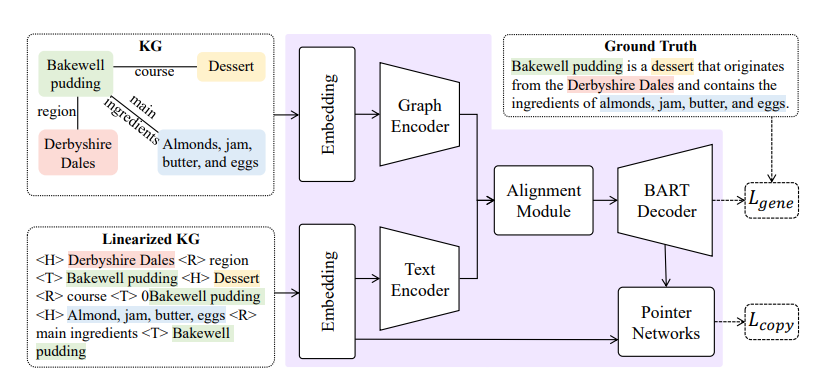 知识图谱到文本(KG-to-text)生成任务旨在生成与输入知识图谱一致的高质量文本,其中生成模型需要对知识图谱的结构和内容进行编码,并有效地将潜在表示解码为目标文本。传统工作将知识图谱到文本(KG-to-text)生成视为序列到序列任务,并对预训练模型(PLM)进行微调,以从线性化的知识图谱生成目标文本。然而,知识图谱的线性化和PLM的结构导致了大量图结构信息的丢失。此外,由于结构信息和文本信息之间的差异,PLM缺乏一个明确的图文对齐策略。