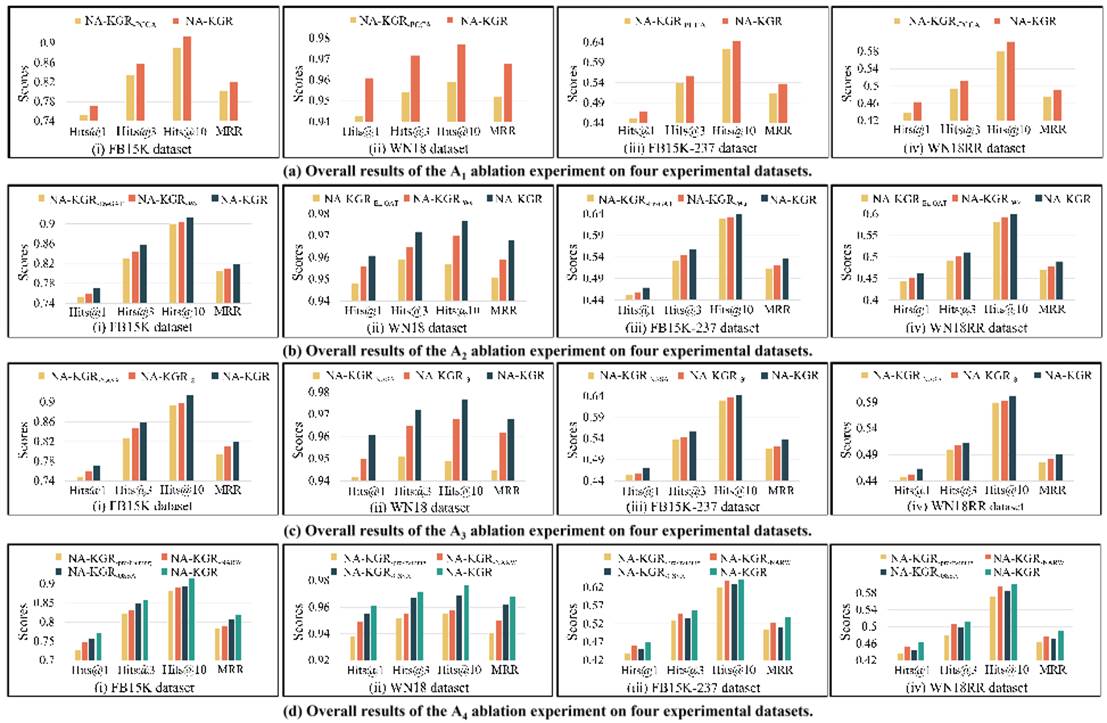最后,在链接预测任务中进行的大量对比(如表1所示)和消融实验(如图4所示)清晰地表明论文所提出的NA-KGR模型能够获得当前基于GNN方法的最优结果。