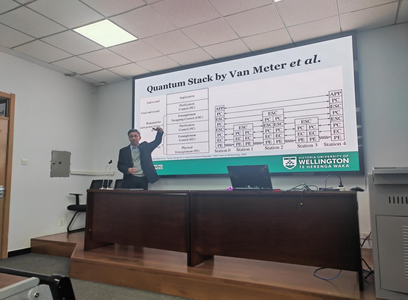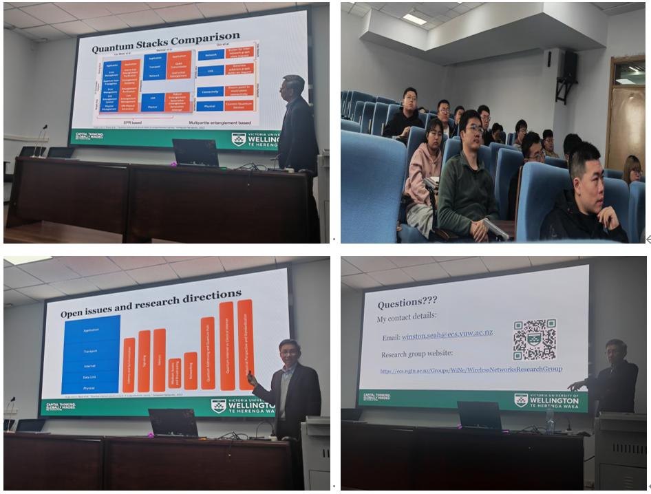 2023年4月26日下午,应44118太阳成城邀请,新西兰惠灵顿维多利亚大学工程和计算机科学学院Seah Khoon Guan教授在44118太阳成城一楼多媒体报告厅(119室)为我院师生作题为“量子网络”的学术讲座。本场讲座由44118太阳成城李乌云格日乐副教授主持,副院长黄宝琦教授、李华教授、贾冰副教授、许岗副教授及无线网络相关方向教师、研究生和本科生现场聆听了本次讲座。
