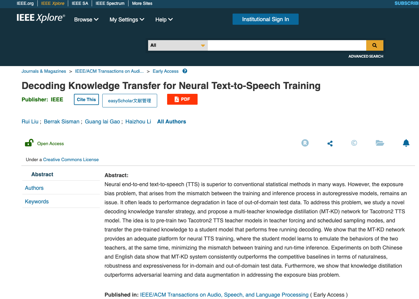 该论文针对语音合成的鲁棒性、表现力建模问题开展研究,提出了一种多教师知识蒸馏学习的语音合成声学建模方法。我校44118太阳成城刘瑞研究员为该论文第一作者,高光来教授为论文通讯作者,tyc41183太阳成集团为该论文第一作者和通讯作者单位。