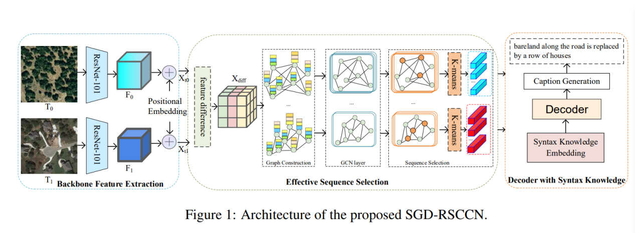 摘要:随着遥感技术的不断进步,获取高分辨率、多时相、多光谱影像变得越来越容易。这些图像携带了丰富的地物信息。然而,如何有效地从复杂的图像数据中提取有用信息并将其转化为可理解的语义描述仍然是一个挑战。为了解决这些问题,我们提出了一种场景图和依赖语法增强的遥感变化描述网络(SGD-RSCCN),以提高遥感图像中变化信息提取和描述的准确性和自然度。该网络通过结合先进的视觉分析技术和自然语言处理技术,不仅优化了对复杂场景理解不足的问题,而且增强了对动态变化的捕捉能力,从而生成更准确、流畅的自然语言描述。此外,我们还提出了基于先验知识的解码器,进一步提高了描述的可读性和可理解性。在LEVIR-CC和Dubai-CC数据集上的大量实验验证了该方法在生成准确、真实的描述方面的优势。