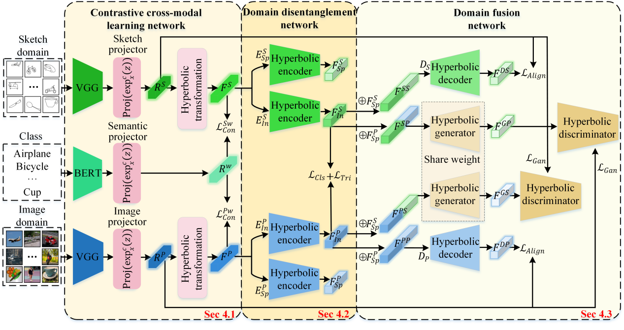 为了解决这些问题,该工作提出了一种基于双曲神经网络的ZS-SBIR框架,该框架考虑了领域解耦与融合学习,称为“DDFUS”。首先在双曲空间中利用双曲神经网络实现特征解耦与融合,其中特征解耦用于解决跨领域特征耦合问题,减少无关特征的干扰;特征融合用于实现领域特征重构和跨领域特征生成,增强跨领域特征的表示和检索能力。其次,结合预训练语言模型的对比跨模态学习网络,在双曲空间中构建语义层级信息,以进一步增强特征解耦与融合的效果。实验结果表明,所提方法在三个公开的零样本草图检索数据集上都取得了显著的性能提升。