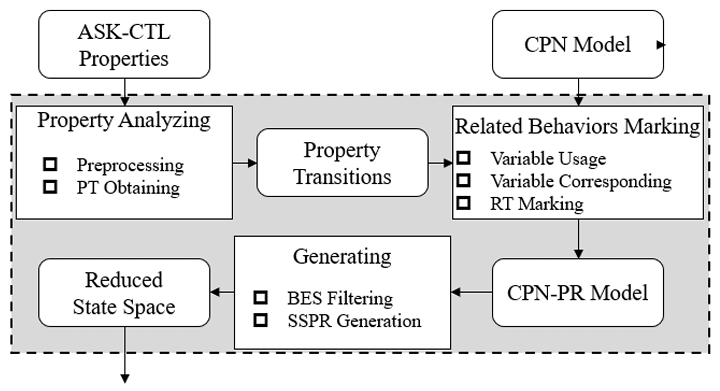 该方法提出CPN-PR模型的概念及相关定义,扩展了着色Petri网模型的属性相关性描述能力,并根据属性相关的并发行为不会影响属性检测结果的原理,有效实现了约简状态空间的自动生成。图2概述了方法总体框架,具体包含属性分析(Property Analyzing)、属性相关行为自动标记(Related Behaviors Marking)、可激活绑定元素过滤(BES Filtering)的以及约简状态空间约简生成(SSPR Generation)方法。