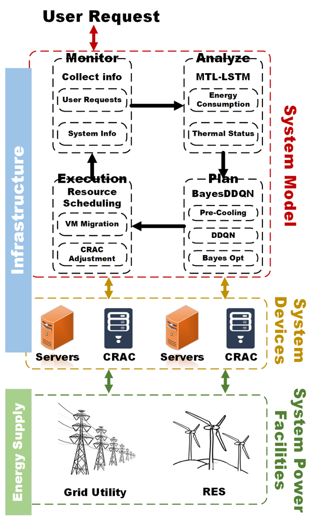 云数据中心规模和数量不断扩大导致能耗及碳排放的显著增加。主要的云服务供应商已经开始探索利用传统电能和可再生能源共同为云数据中心供能,形成混合供能云数据中心。然而,由于资源请求的随机性以及可再生能源的波动性和间歇性,采用混合供能方式的云数据中心往往存在虚拟机过度整合或过度制冷导致的整体能耗浪费。为了解决这个问题,论文基于“MAPE”的设计原则,提出基于深度强化学习的云数据中心整体能耗优化框架。