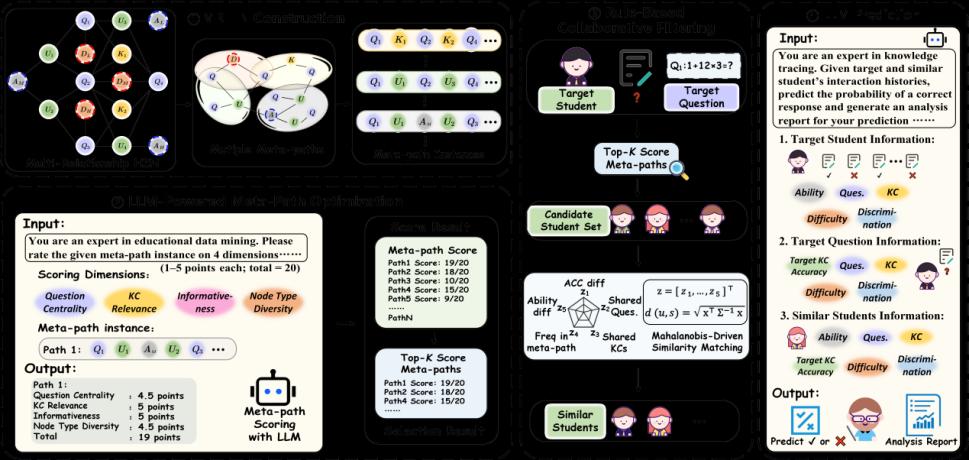 论文题目:HISE-KT: Synergizing Heterogeneous Information Networks and LLMs for Explainable Knowledge Tracing with Meta-Path Optimization 作者:段智议(tyc41183太阳成集团研究员),史子星(tyc41183太阳成集团2024级硕士研究生),袁宏宇(tyc41183太阳成集团2025级博士研究生),王琪(吉林大学副教授) 论文简介:知识追踪(KT)旨在挖掘学生知识状态的演变轨迹,并预测其未来的问题回答表现。然而,现有基于异构信息网络(HINs)的方法容易因元路径的手动或随机选择而引入噪声,且缺乏对元路径实例的必要质量评估。同时,基于大型语言模型(LLMs)的方法则忽视了跨学生的丰富信息,两种范式都难以持续提供准确且基于证据的解释。为解决这些问题,本文提出了一种创新的HIN-LLM协同增强的知识追踪框架(HISE-KT),该框架实现了HINs与LLMs的无缝整合。HISE-KT首先构建包含多种节点类型的多关系HIN,通过多条元路径捕捉结构化关联。随后运用LLM智能评分和筛选元路径实例,保留高质量路径,开创了元路径质量自动评估的先河。受教育心理学原理启发,本文设计了基于元路径的学生检索机制,为预测提供更有价值的上下文信息。针对四个公开数据集的实验表明,HISE-KT在预测性能和可解释性方面均优于现有KT基线模型。本文的研究通过将HINs与LLMs协同融合,为发展透明、自适应的教育人工智能建立了新范式。 |