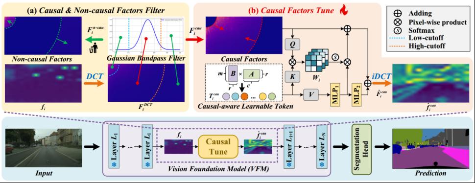 论文题目:Causal-Tune: Mining Causal Factors from Vision Foundation Models for Domain Generalized Semantic Segmentation 作者:张印(哈尔滨工业大学21级博士生),张永强(tyc41183太阳成集团 研究员),郑尧月(西安交通大学21级博士生),Bogdan Raducanu(巴塞罗那自治大学),刘丹(哈尔滨工业大学) 单位:哈尔滨工业大学仪器科学与工程学院,巴塞罗那自治大学计算机视觉中心,44118太阳成城 论文简介:在域泛化语义分割(Domain Generalized Semantic Segmentation, DGSS)任务中,仅微调视觉基础模型(Vision Foundation Models, VFMs)的少量参数就可以显著的提升DGSS的性能。现有的方法通常通过训练轻量级adapters或优化中间层特征来提升模型在未知域上的泛化能力。然而,这些方法往往忽视了一个关键问题:预训练的VFMs常常会产生特征伪影,这些伪影会阻碍VFMs中有价值feature的利用,从而削弱DGSS的性能。受因果机制的启发,本文发现这些伪影与非因果因素相关,而这些非因果因素通常存在于VFMs特征谱的低频和高频部分。本文针对DGSS任务,显式地分析了VFMs特征中的因果与非因果因素,并提出了一种简洁而高效的方法来识别并解耦二者,从而实现更稳健的域泛化。为此,本文提出了Causal-Tune——一种新颖的微调策略,旨在从VFMs特征中提取因果因素并抑制非因果因素。首先,本方法利用离散余弦变换(Discrete Cosine Transform, DCT)提取每一层特征的频谱;随后,采用高斯带通滤波器将频谱划分为因果与非因果部分。为了进一步优化因果部分,本方法在频域中引入了一组因果感知的可学习tokens来进行特征增强,而非因果部分则被丢弃。最后,将优化后的因果特征通过逆DCT转换回空间域,并输入下一层。本方法在大量跨域实验中验证了Causal-Tune的有效性,尤其在恶劣天气条件下表现突出,如雪天场景中相比基线方法mIoU提升了4.8%。 |