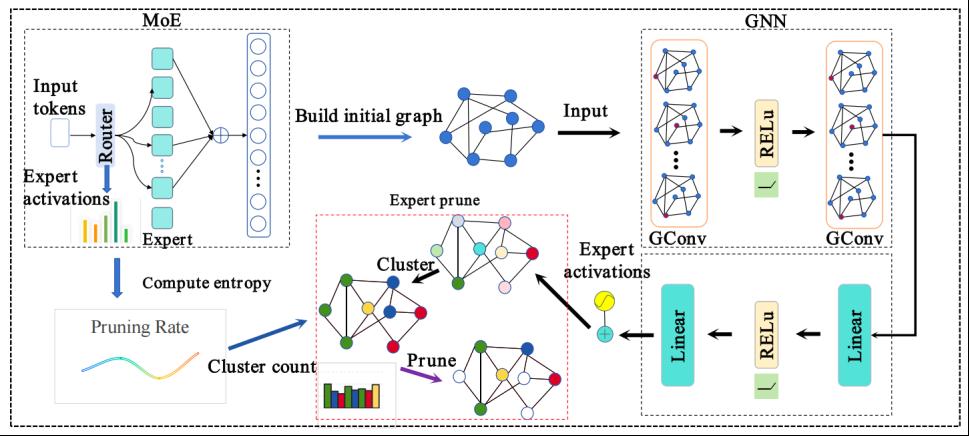 论文题目:C-GNN-PRUNE: A Unified Graph-Based Framework for Structure-Aware Pruning of Mixture-of-Experts Models 作者:李林(tyc41183太阳成集团24级硕士研究生)、王燕(tyc41183太阳成集团 副教授)(通讯作者)、王卓鹏(tyc41183太阳成集团24级硕士研究生) 论文简介:稀疏专家混合(MoE)结构在扩展大型语言模型(LLMs)方面展现出卓越的计算效率,但其庞大的参数规模仍然制约了部署效率。现有剪枝方法多忽视专家间的结构依赖与层间异质性,导致剪枝后性能退化与结构破坏。针对上述问题,本文提出统一的结构感知剪枝框架 C-GNN-PRUNE,通过图神经网络(GNN)建模专家间的交互关系,实现基于结构的专家选择与压缩。该框架首先设计基于熵的层级剪枝分配策略,根据专家激活分布熵自适应分配剪枝预算;随后构建专家交互图,融合输出相似度与路由差异信息,经由两阶段GNN学习结构感知嵌入;再通过社区检测机制识别功能冗余的专家簇,并在簇内基于激活频率执行保留与裁剪,从而在稀疏性与表达力间取得平衡。在 DeepSeek-V2-Lite、Qwen1.5-MoE-A2.7B 与 Mixtral-8×7B 三个开源模型上的实验结果表明,C-GNN-PRUNE 在不同剪枝率下均能显著提升压缩后的模型性能稳定性与任务泛化能力。与 C-PRUNE、EEMoE、Wanda 等方法相比,本方法在平均任务精度上最高提升达 4.3 个百分点,在保持高压缩比的同时有效维持模型表达多样性。该研究为实现结构保持、低资源开销的 MoE 模型压缩提供了一种统一且可扩展的解决方案。 |