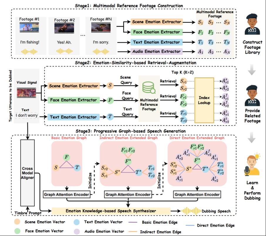 论文题目:Towards Authentic Movie Dubbing with Retrieve-Augmented Director-Actor Interaction Learning 作者:刘瑞(tyc41183太阳成集团 教授)、赵源(tyc41183太阳成集团25级博士研究生)、贾真琦(tyc41183太阳成集团25级博士研究生) 论文简介:自动电影配音模型能根据给定剧本生成生动语音,通过简短的音色提示还原说话 人的音色,同时确保与无声视频的口型同步。现有方法模拟了演员直接配音且无需准备的简化流程,忽略了关键的导演- 演员互动环节。相比之下,真实配音流程涉及动态协作:导演会积极与演员沟通,引导他们在配音前内化语境线索,尤其是情感层面的线索。为解决这一问题,我们提出一种新的检索增强型导演 - 演员互动学习方案,以实现真实感电影配音,该方案被命名为Authentic-Dubber,包含三大创新机制:(1)构建多模态参考素材库,模拟导演提供的学习素材。通过整合大型语言模型(LLMs),实现对跨模态信号情感表征的深度理解。(2)提出基于情感相似度的检索增强策略,模拟演员在配音过程中高效、全面内化导演提供素材的过程。该策略会检索与目标无声视频最相关的多模态信息。(3)开发基于渐进式图结构的语音生成方法,逐步融入检索到的多模态情感知识,从而模拟演员的最终配音过程。上述机制使Authentic-Dubber 能够忠实复刻真实配音流程,在情感表现力上实现全面提升。在 V2C-Animation 基准数据集上的主观和客观评估均验证了该方案的有效性。 |