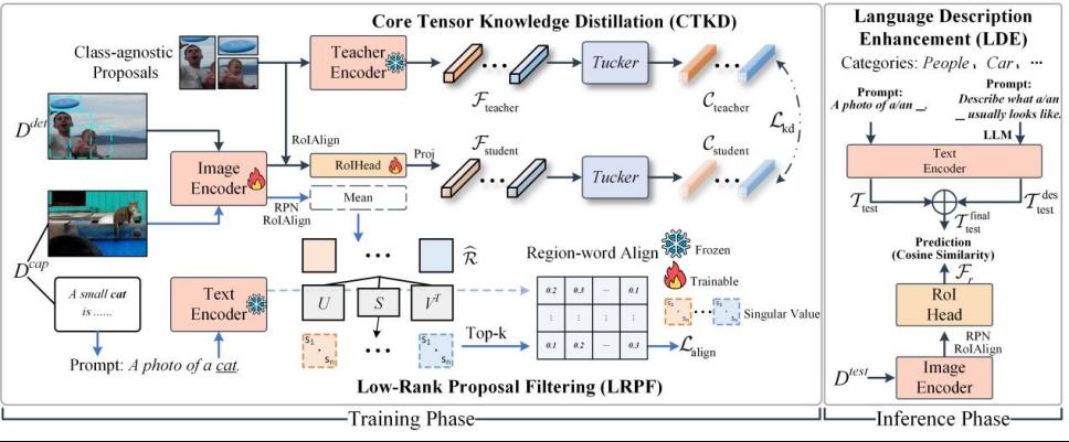 论文题目:Tensor Decomposition and Language Description for Open-Vocabulary Object Detection 作者:梁秋雨(tyc41183太阳成集团24级博士研究生),张永强(tyc41183太阳成集团)(通讯作者) 论文简介:开放词汇目标检测(Open-vocabulary Object Detection,OVOD)旨在突破固定类别限制,实现对未见目标的检测与识别。虽然现有研究基于区域-词语对齐(region-word alignment)和知识蒸馏(knowledge distillation)方面取得了进展,但其性能仍受三大问题制约:区域与词语对齐不精确、知识蒸馏存在冗余传递,以及类别嵌入表示质量较低。针对上述问题,本文提出了一种结合张量分解(Tensor decomposition)与语言描述(Language descriptions)的新颖的开放词汇目标检测框架,TLDet。在传统方法中,最高相似度得分的候选框常聚焦于判别性强但局部不完整的区域(如仅包含目标头部),导致区域-词语对齐偏差。为此,本文提出了低秩候选框筛选模块,通过奇异值分解计算候选框特征矩阵的奇异值之和,定量衡量其结构完整性,从而筛除判别性强但不完整的区域,显著提升视觉区域与文本语义之间的对齐精度。为避免知识蒸馏过程中的信息冗余,TLDet进一步引入核心张量蒸馏方法。该方法基于 Tucker 分解,将教师模型与学生模型的特征映射为核心张量,通过核心张量的优化对齐,实现高效且有选择性的知识迁移,使学生模型能够聚焦于教师模型中的关键特征表示。此外,为增强类别语义嵌入的表达能力,本文设计了语言描述增强机制。该机制在推理阶段引入大语言模型(LLM)的语义知识,通过生成丰富的类别语言描述,弥补开放词汇场景中长尾类别和模糊类别的语义缺失问题,从而提升类别嵌入的区分性与泛化能力。在 COCO 与 LVIS 主流开放词汇目标检测数据集上的实验结果表明,TLDet 在新类别检测任务中表现突出,分别取得 36.1% 的 mAP 和 30.1% 的 mask mAP,显著超越现有开放词汇检测方法,验证了其在开放世界视觉理解中的有效性与优越性能。 |