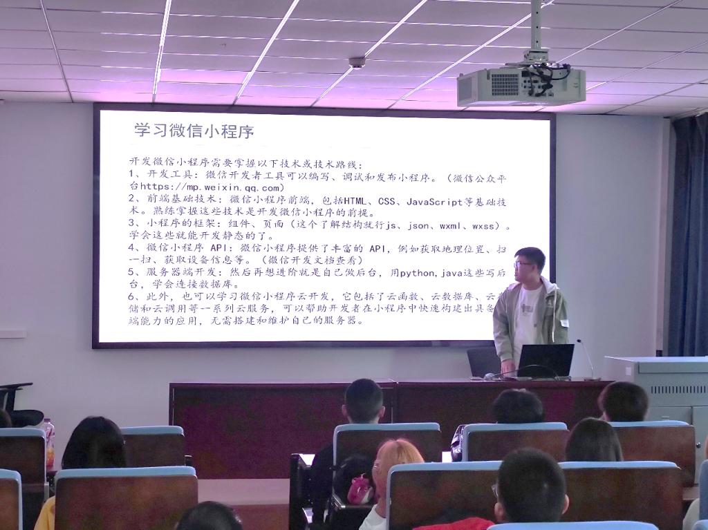 支部成员2019级王伟光同学以“自我学习之路——微信小程序开发”为题,对微信小程序的学习实践之路进行了分享。