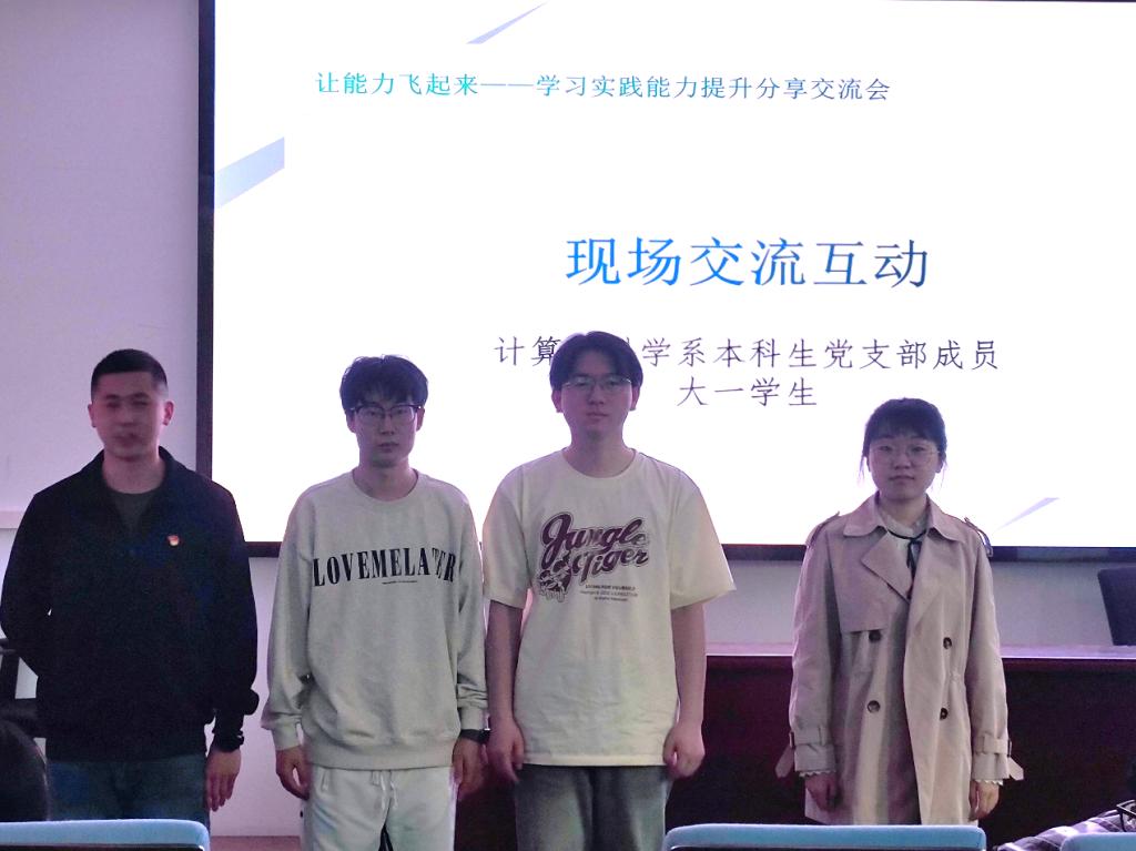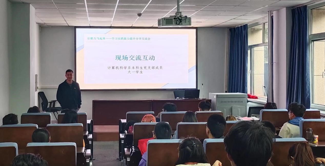 为深入学习贯彻习近平新时代中国特色社会主义思想,积极开展学习贯彻习近平新时代中国特色社会主义思想主题教育工作,计算机科学系本科生党支部以服务学生为本,于2023年4月22日下午在学院119报告厅举办了“学长分享:如何让能力飞起来——学习实践能力提升分享会”。活动邀请学业成绩优秀和实践能力突出的学长进行分享,进一步提高低年级同学对专业学习和实践能力培养重要性的认识,激发同学们的学习实践热情。活动由支部书记卢慧老师主持,党支部成员和低年级学生参加了本次活动。