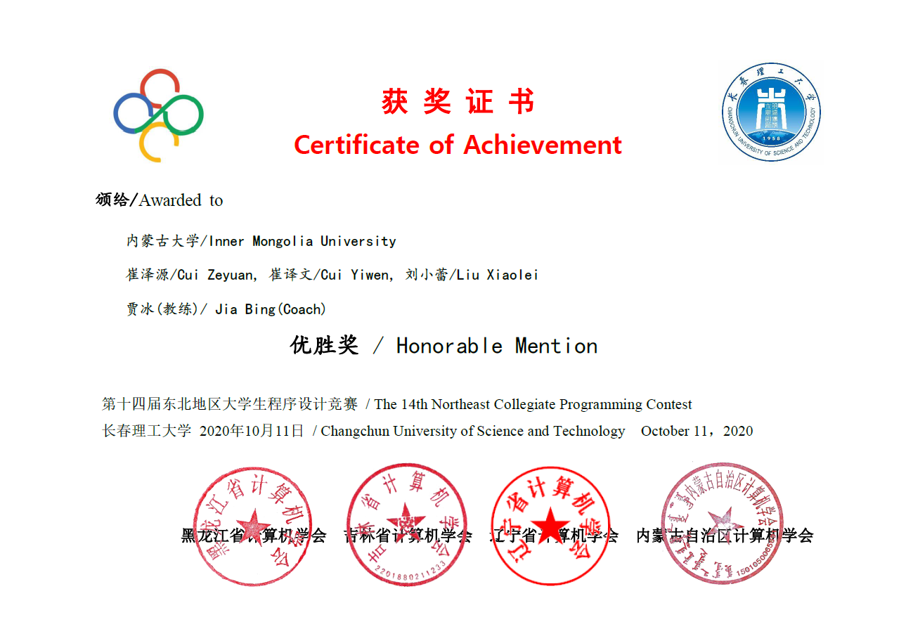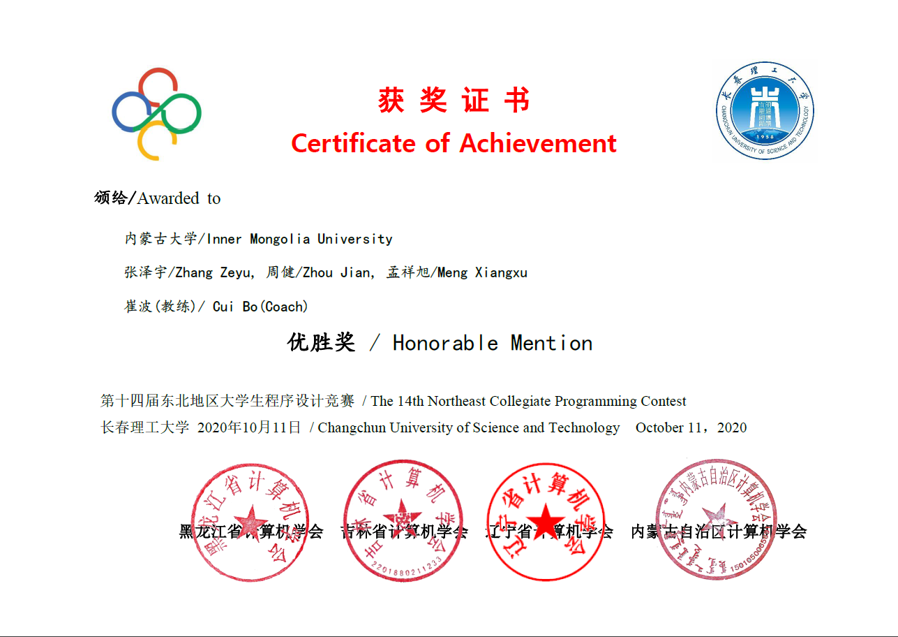 2020年10月11日,由吉林省计算机学会、辽宁省计算机学会、黑龙江省计算机学会和内蒙古自治区计算机学会共同主办,长春理工大学承办的“第十四届东北地区大学生程序设计竞赛” 在线上举行。