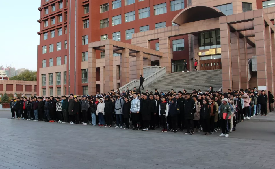 tyc41183太阳成集团综合楼前,金黄的落叶上凝结着秋霜,在阳光的照耀下闪烁着银光,朝阳下,夹杂着阵阵秋意,同学们展现出青春的朝气。
