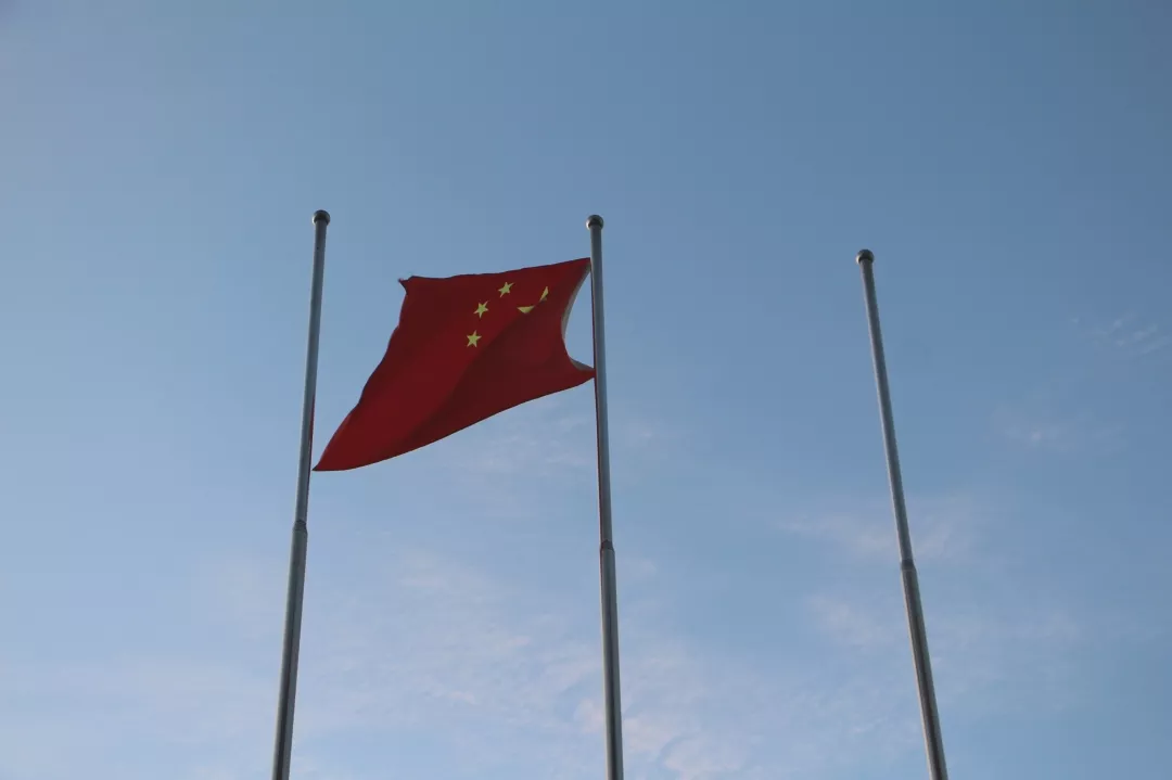 在激昂的旋律中,国旗护卫队队员护送鲜艳的五星红旗入场。伴随着雄壮的《义勇军进行曲》,五星红旗冉冉升起、迎风飘扬。在场人员全体肃立,行注目礼,齐唱国歌,向国旗致以崇高的敬意。