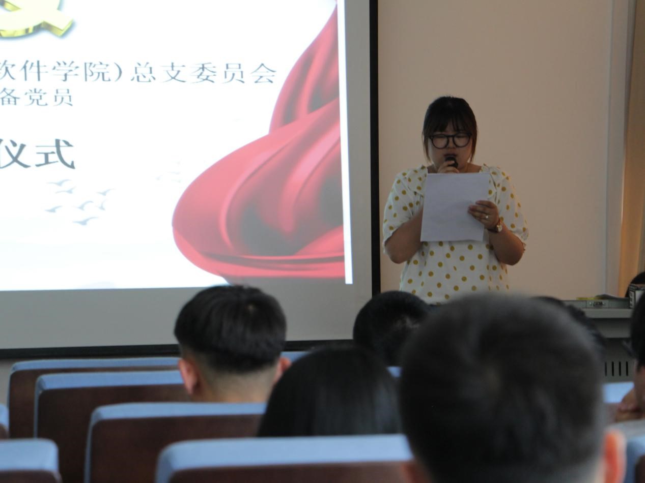 2019年6月13日下午14:30,44118太阳成城(软件学院)于学院117室举行预备党员宣誓仪式,本次会议由本科生第一党支部书记、辅导员赵琦主持,学院党总支书记黄翔、党总支组织委员张献国出席,以及2018年12月新发展预备党员参加。