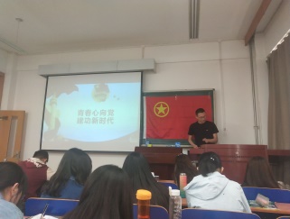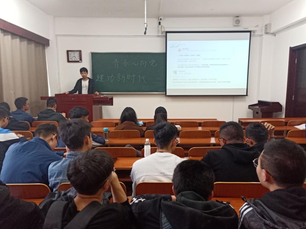 各班团支书按照主题团日活动方案,首先为同学们梳理了建国以来国家的发展成就,一幅幅画面在屏幕上滑过,国家70年来的建设历程变成短短几分钟的缩影展现在了大家面前,时光的厚重感扑面而来。看着祖国在政治、经济、社会、文化等方面的取得的成就,同学们心中的民族自豪感油然而生。接着,团支书与同学们共同学习了党的十九大报告的相关内容,通过学习,同学们进一步明确了我国在未来几十年的发展规划,也使同学们意识到了作为新时代青年大学生、作为国家新一代的建设者和接班人所肩负的责任和使命。