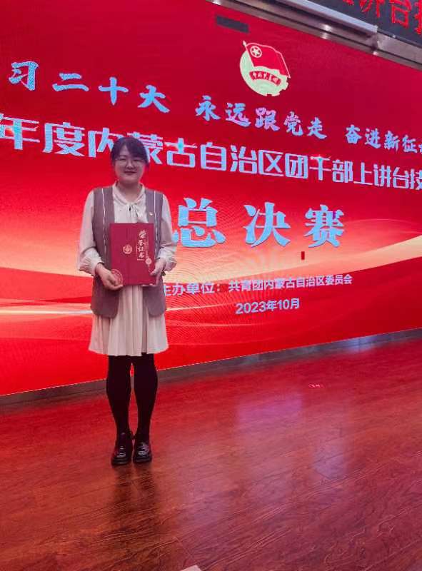 2023年10月,自治区团委在内蒙古青年政治学院举办了2023年度内蒙古自治区团干部上讲台技能大赛,来自全区高校、机关、企业的120余名优秀选手同台比赛。我院团委副书记参加了竞赛,以高校专项赛第三名进入总决赛,并在11月3日的总决赛中获优秀奖。