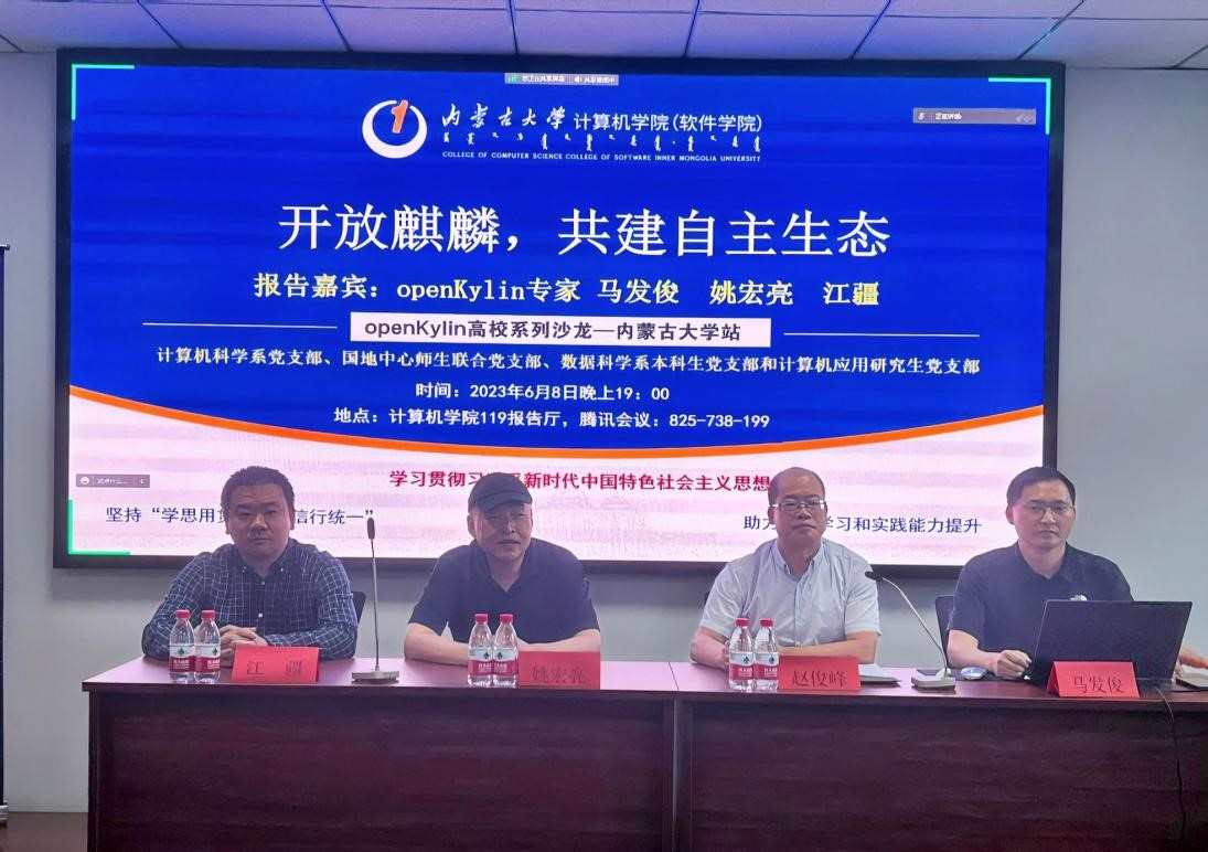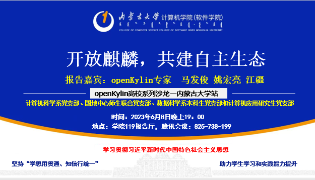 为深入开展学习贯彻习近平新时代中国特色社会主义思想主题教育,努力在以学铸魂、以学增智、以学正风、以学促干方面取得实实在在的成效。202368日晚上7点,我院计算机科学系党支部、国地中心师生联合党支部、数据科学系本科生党支部和计算机应用研究生党支部在学院119报告厅联合开展题为“开放麒麟,共建自主生态”主题党日活动。本次主题党日活动,旨在加强校企合作交流,激发学习热情、拓展学生学术视野、提升创新实践能力。